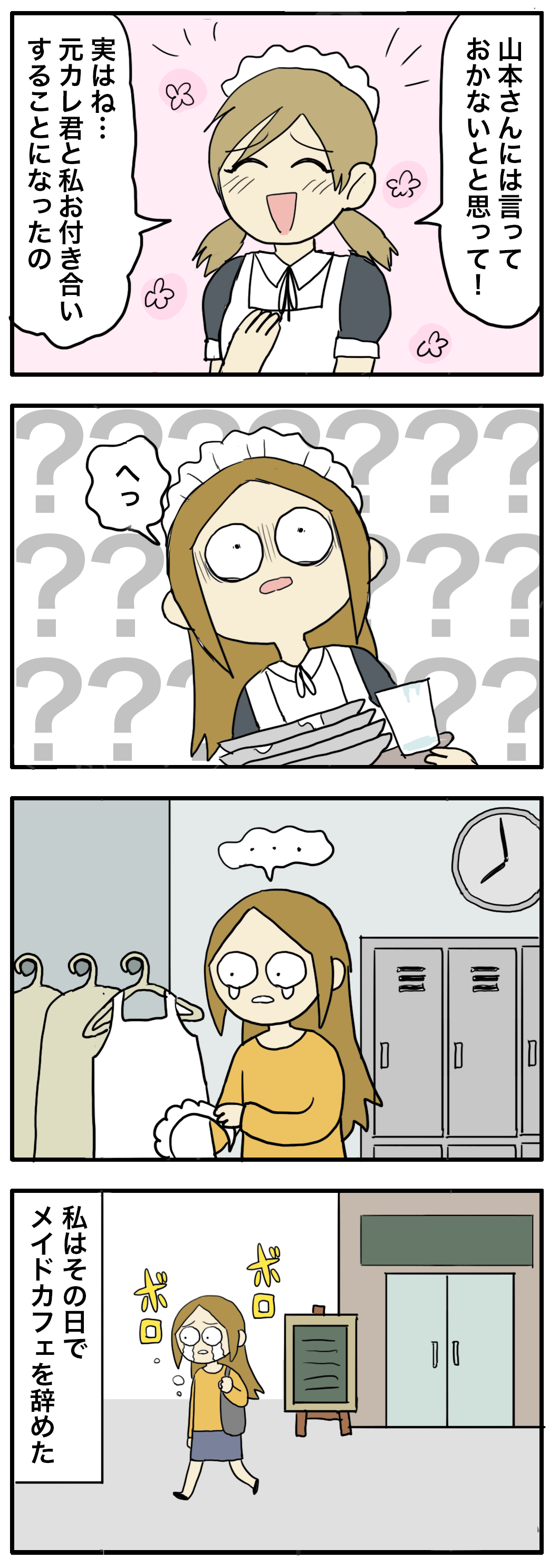 2020年08月16日 メイド時代の悲劇:H先輩からの報告(5) メイド時代に起きた悲劇の事件話続き物5話目です🖋👇前回のお話はこちら👇フラれてから1週間後💀私たちの同棲時代に遊びに来てくれたH先輩に呼び止められました👐当時私は元カレ君とは別れたくない状態でフラれて無茶苦茶落ち込んでいました、そんな時に報告されたH先輩からの報告があまりにもショックで店を辞めました。とてもじゃないけど一緒に働けるような精神状態ではなかったです💀💀💀フラれてから1週間後という早さで付き合っていた報告は傷心のわたしには効きまくりなのでした。メイド時代の悲劇1メイド時代の悲劇2メイド時代の悲劇3メイド時代の悲劇4読者登録していただけるとラインで読めます📩応援クリック嬉しいです♪ 🙏❤️ 「アルバイト時代」カテゴリの最新記事