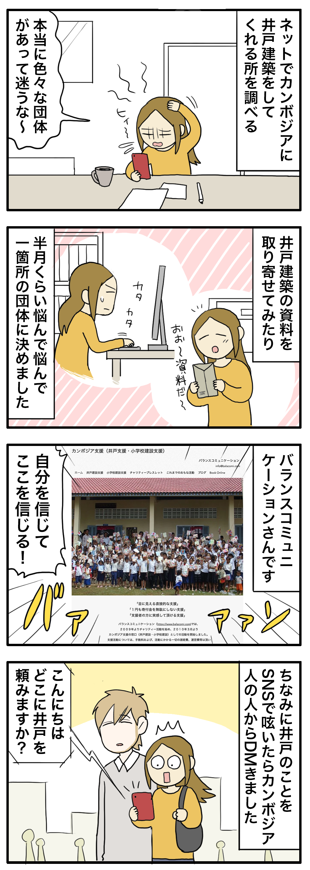 井戸建設をするにあたりボランティア団体を選ぶのはとても大変でした、とても多くの慈善団体がカンボジアへの井戸建築をしており疑心暗鬼になりながらの依頼先探し…結果私が決めたのはバランスコミュニケーションさんでした。