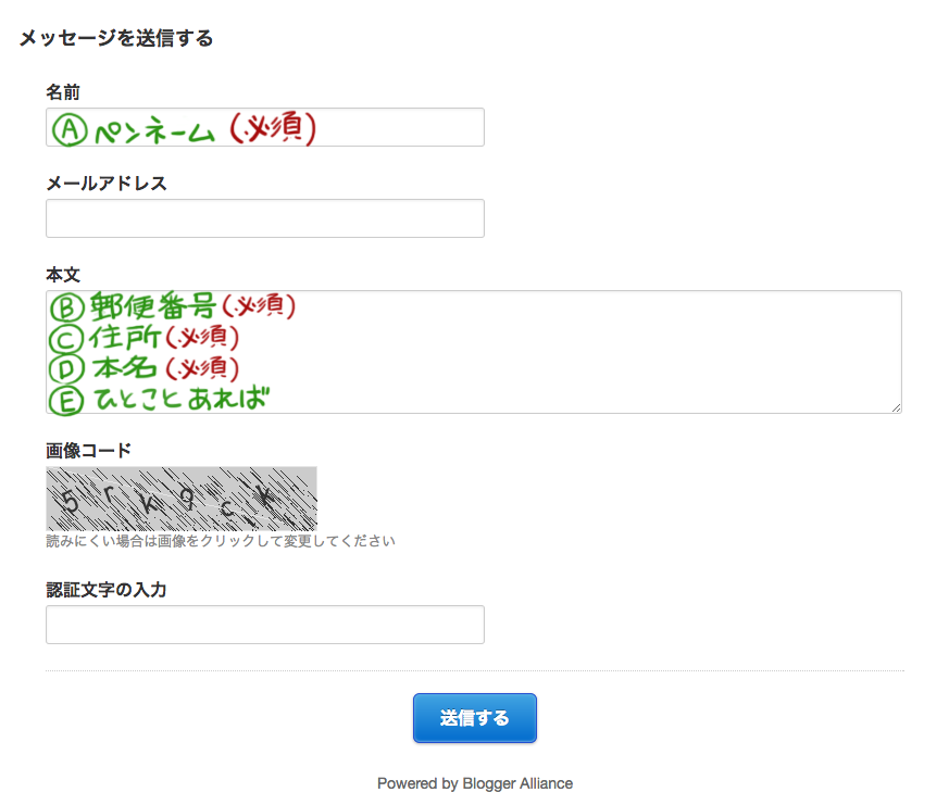 ブログ上部分にある" お便り"から以下を記入して頂きメッセージを送ってください。