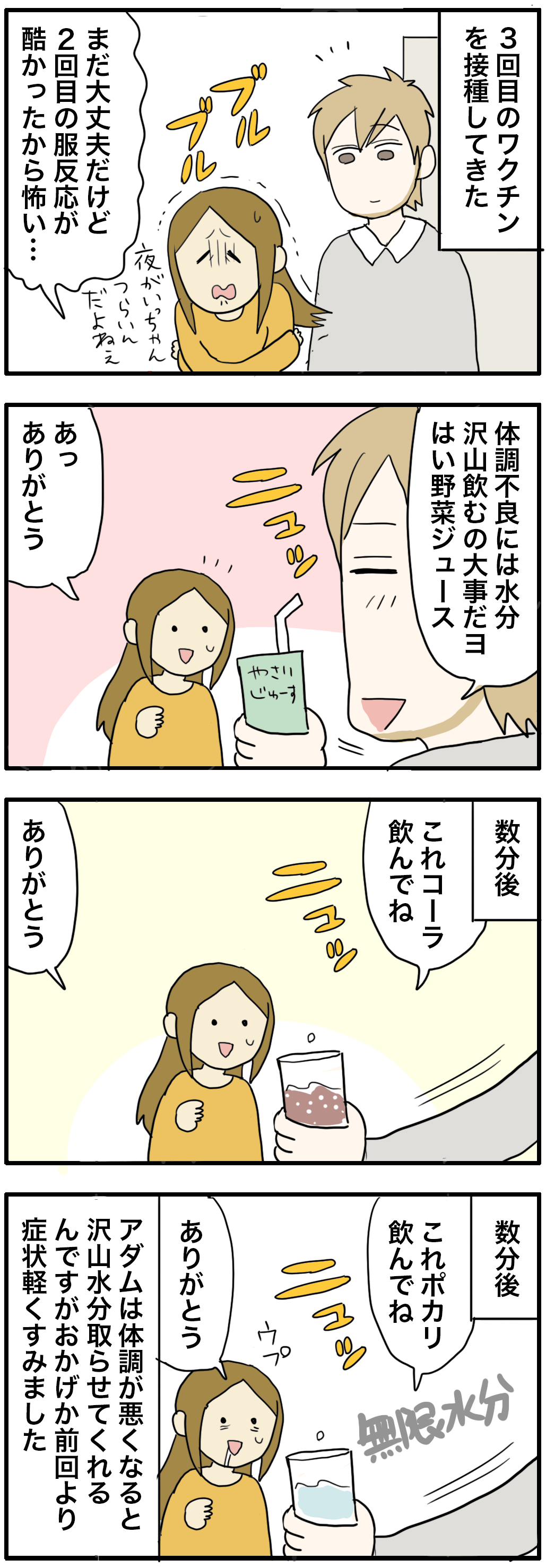 アダムは私が風邪をひいたり体調を崩すとすごく水をくれます、今回ワクチンの服反応に怯えていた私に対してもやっぱりそうで…たくさんの水分をとらせてくれました笑